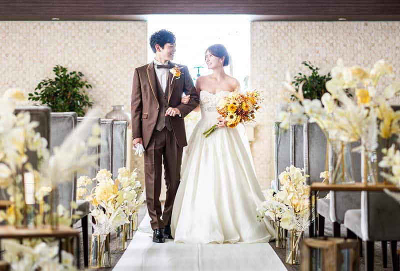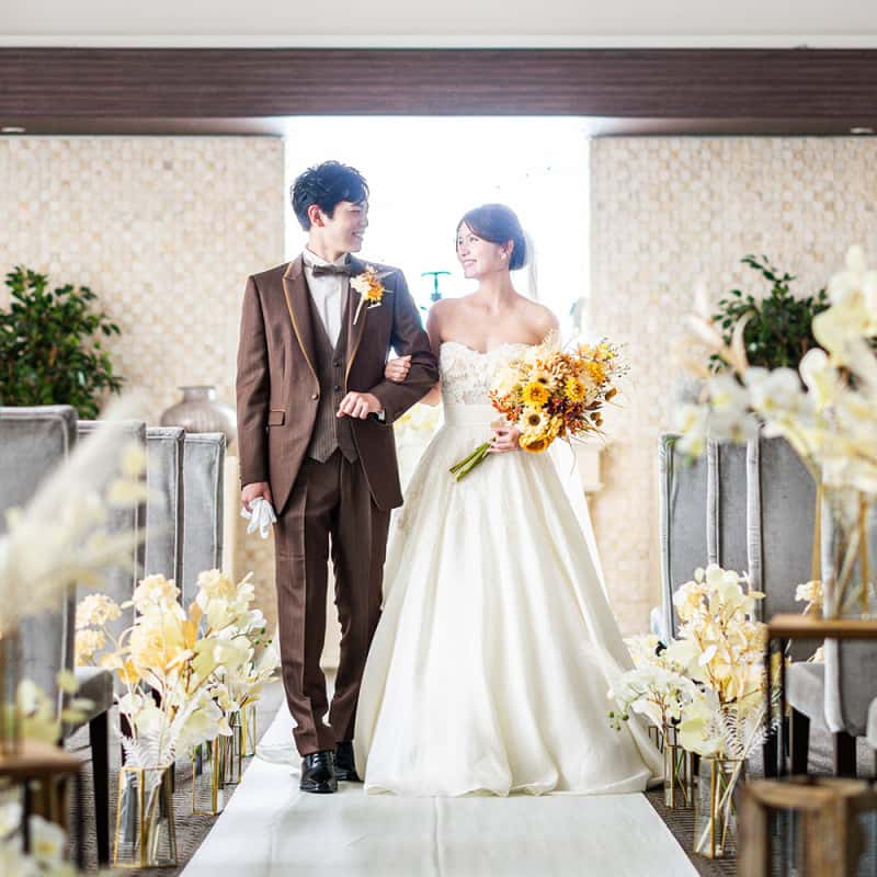 天井高18m・バージンロード20mでの厳粛な挙式。