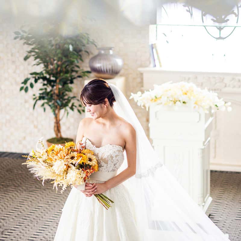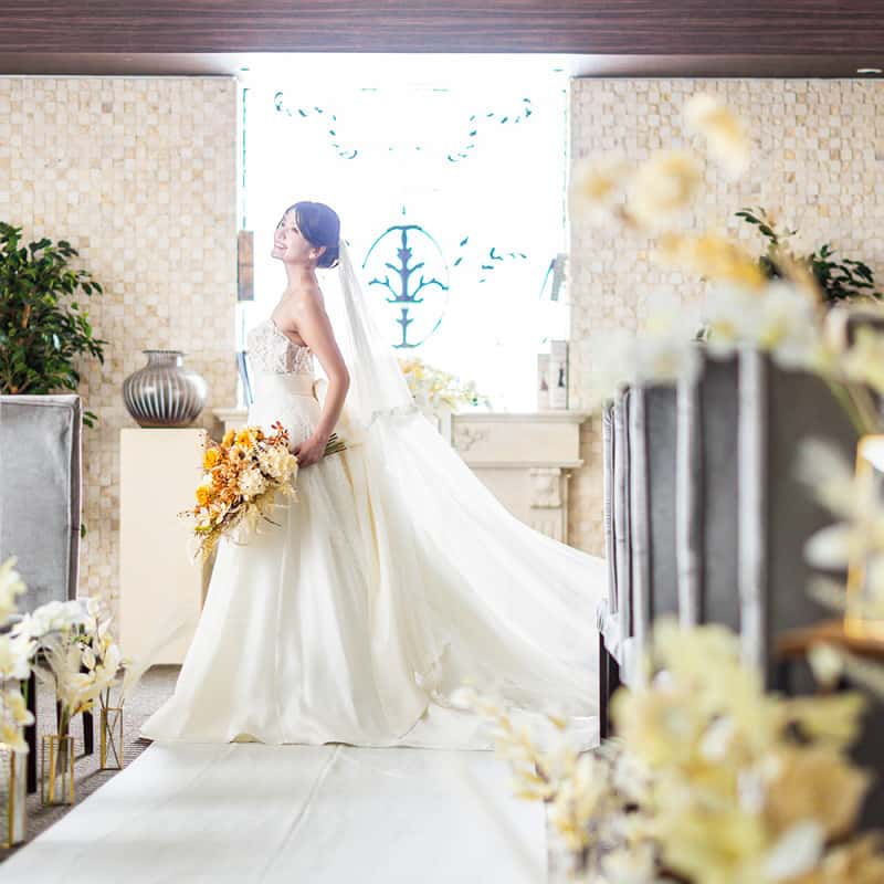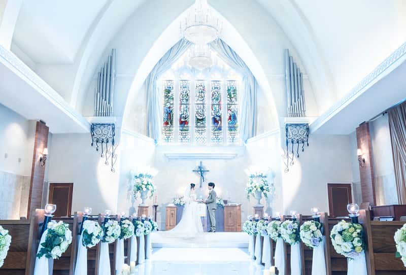 100年の歴史を誇る英国製ステンドグラスのやさしい光に包まれる挙式は感動的です。