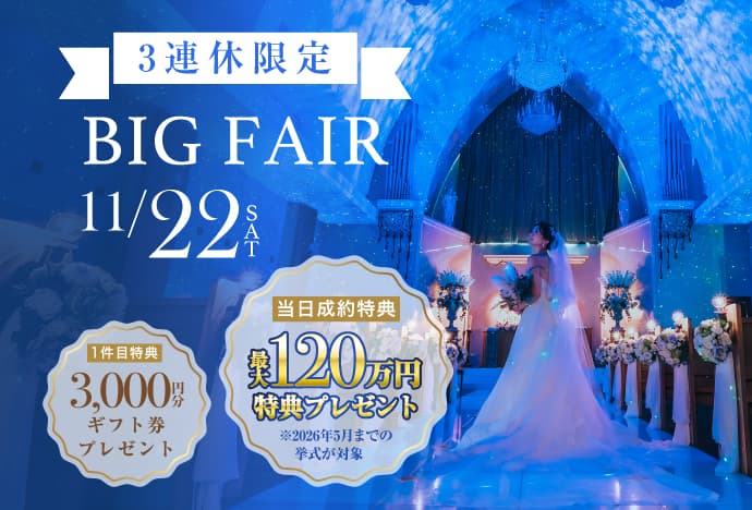 【BIGフェア特典】来館当日のお申込みで<最大120万円特典>プレゼント✨(挙式料、衣裳、会場費など) ※時期や人数により特典内容が異なります