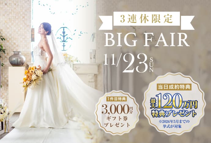 【BIGフェア特典】来館当日のお申込みで<最大120万円特典>プレゼント✨(挙式料、衣裳、会場費など) ※時期や人数により特典内容が異なります