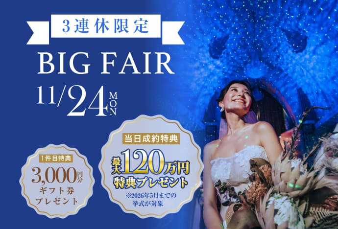 【BIGフェア特典】来館当日のお申込みで<最大120万円特典>プレゼント✨(挙式料、衣裳、会場費など) ※時期や人数により特典内容が異なります