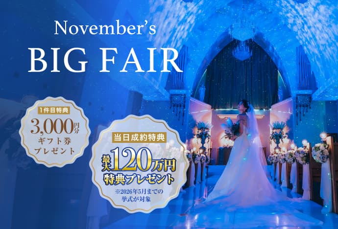 【BIGフェア特典】来館当日のお申込みで<最大130万円特典>プレゼント✨(挙式料、衣裳、会場費など) ※時期や人数により特典内容が異なります